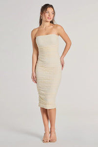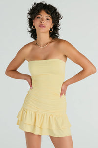 Here comes the sun and you radiating trendy vibes in this strapless mini dress perf for casual plans! The ruched sides and ruffled hem add a playful touch to the bodycon silhouette.