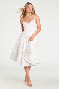 Dreamy days call for this floral midi dress that makes your cottagecore romance a reality! With a gorgeous corset bodice, lace-up back, and voluminous A-silhouette, this dress is stunning for bridal showers or garden parties.