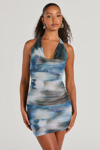 Make an impression in this abstract print mesh mini dress for an artsy vibe! With a halter cowl neckline and a spaghetti strap tie, you'll turn heads wherever you go. Side ruched seams create a flattering, bodycon fit that accentuates your curves along the mini-length hem. Complete the look in hoop earrings and a clutch!