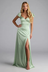 The silky satin and curve-flattering silhouette make the Olessa formal dress feel so special! The dress boasts adorable flutter short sleeves and a chic A-line silhouette with a high front slit for effortless movement.