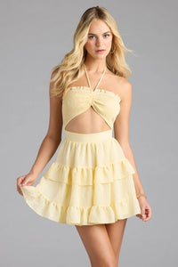 Get swept off your feet in this cute skater dress for any casual occasion! With its halter neckline and cutout bodice, this dress is designed to show off your figure, while the ruffled mini-length hem adds a flirty touch.