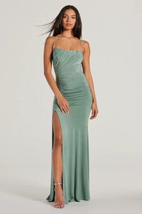Look sensational in the inspiring allure of the Candace mermaid formal dress perfect for bridesmaids, wedding guests, or banquets! This stunning dress features a square neckline, padded bra cups, and spaghetti straps for a flattering fit. The lace-up back and front ruched seam adds a touch of sophistication, while the high slit and mermaid silhouette create a graceful and alluring look along the floor-length hem. Complete the look with a necklace and earrings.