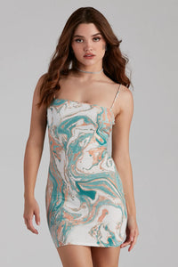 You'll look mesmerizing in this trendy-chic marble print mini dress! It features a sleeveless square neckline, spaghetti straps, a short, curve-hugging, bodycon silhouette, and an all-over marble print pattern. Style this dress with clear heels.