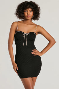 - Mini-length, form-fitting, bodycon silhouette