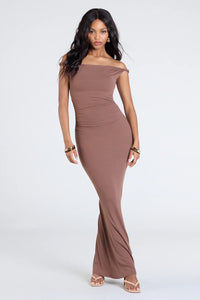 Show off your alluring curves in this off-the-shoulder maxi dress crafted from a rib knit fabric that fits like a glove!