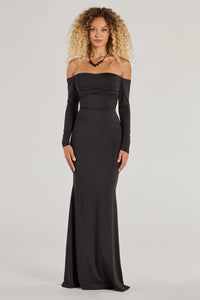 Serve a sleek silhouette in the Haven formal dress designed with a smooth knit fabric with plenty of stretch. It features an off-the-shoulder sweetheart neckline with a ruched bodice, long fitted sleeves, a cutout lace-up strappy back design with lower back ruching, and a floor-length mermaid fit to highlight your stunning curves.