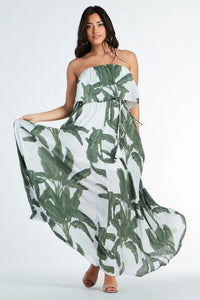 Jet set to your gorgeous getaway in this tropical woven maxi dress! The lightweight gauze woven fabric features a bold tropical print to bring the allure to your dreamy vacay. The maxi-length dress is shaped with a strapless straight-across neckline with a ruffled fold-over design to add a flirty flair. The fitted high waist seam has an elasticized design for added stretch and a thin tie-front belt with cute tassel accents. The dress flows out to a floor-length hem with an effortless A-line silhouette. Style this maxi dress with strappy sandals.