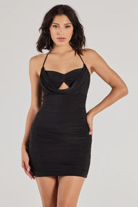 Be the talk of the club in this sexy bodycon mini dress showcasing a sweetheart cowl halter neckline and a cutout bust. Style the dress with heels.
