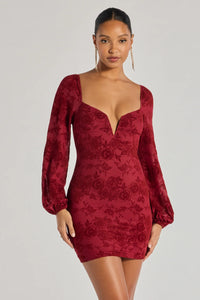 The mini dress features a floral burnout pattern, a plunging wired v-neckline, long balloon sleeves, and a fitted bodycon silhouette. Complete cocktail outfit with rhinestone heels.