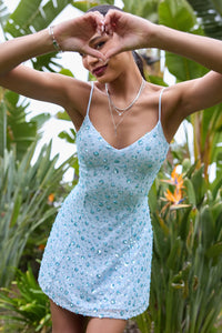 Sparkle and shine in this floral sequin mini dress at graduation or shower celebrations! With a lace-up back that turns heads and a flattering A-line silhouette, this dress makes a statement.