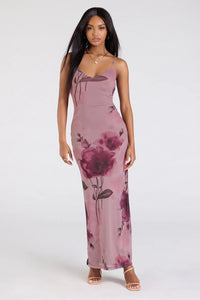 This airy mesh maxi dress speaks your love language designed with a bold floral print and long fitted silhouette. Style with mules for date night.