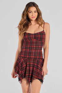 Show your edge in this plaid mesh mini dress featuring a flattering scoop neckline and form-hugging fit with a hanky-style hem. Complete the look with a cardigan.