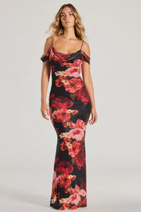 Become a dreamy romantic vision in the Francie floral formal dress as a bridesmaid, wedding guest, or a summer banquet! The cold shoulder neckline, short-sleeve cuffs, and adjustable spaghetti straps create a flattering silhouette. The low cowl back adds a touch of sophistication, while the slim silhouette and floor-length hem exude luxury. Complete the look with rhinestone earrings and a chic clutch.