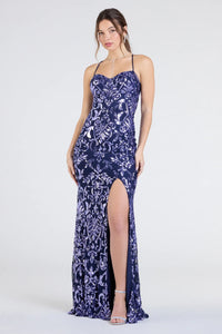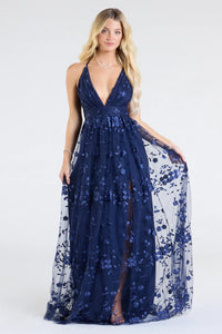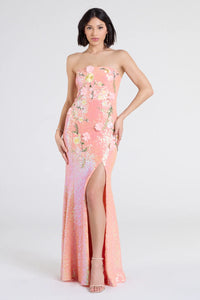 The Minerva floral sequin formal dress is the ultimate glamorous, stunning dress designed with an alluring high front slit and floor-length hem for a chic flair.