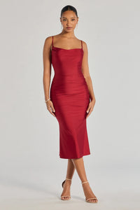 Show off your stunning curves in this sleek midi dress designed with smooth and stretchy knit fabric. It features a sleeveless pleated cowl neckline, spaghetti straps, ruched side and back seams to flaunt your figure, and a midi-length mermaid silhouette.