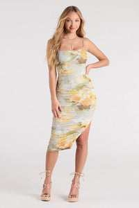 You'll be ready for your trip with this tropical mesh midi dress! This dress features a square neckline, spaghetti straps, and a bodycon fit for a flattering silhouette. The side cutout drawstring adds a touch of fun while the side slit and midi-length offer a sultry feel. Complete the look in trendy sandals.