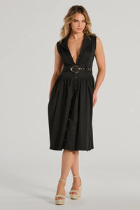 Make your look sweet and simple in this sleeveless midi dress perfect for summer plans! The collared V-neckline and button-down closures offer a classic touch, while the adjustable belted waist gives you a flattering A-line silhouette complete with a midi-length hem. Style this midi dress with wedges and earrings.