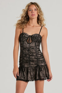 Add a dose of sultry to your night in this lace mini dress for cocktail hour! Featuring detachable and adjustable spaghetti straps, a sweetheart neckline, and padded bra cups for support and comfort. The sheer bust insert adds a touch of sexy, while the ruched bodycon silhouette and ruffled mini-length hem accentuate your figure. Complete the look with earrings.
