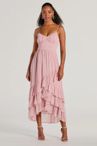 This chiffon midi dress makes every celebration dressy and cute! With a stunning V-neckline and adjustable spaghetti straps, this flowy silhouette will flatter your figure. The tiered ruffled midi-length hem adds a touch of romance and movement to your look. Style this dress with earrings and strappy block heels.