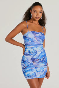 This sleeveless abstract mini dress features stunning lace-up back and side ruched seams that accentuate your curves along the bodycon silhouette. Perfect for a night out or a party.