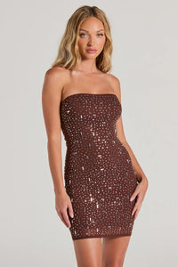 Dazzle up the night like the glam babe you are in this sultry rhinestone bodycon mini dress! The airy mesh fabric is accented with all-over rhinestone embellishments for a glitzy shine and includes a knit lining for coverage. The short dress is shaped with a strapless straight-across neckline and a bodycon silhouette to flaunt your gorgeous curves. Complete your night-out look with metallic heels.