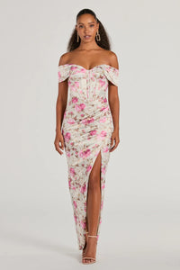Mildred Off-The-Shoulder Floral Satin Formal Dress