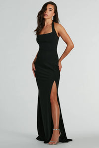 Lydia Halter Slit Mermaid Crepe Formal Dress