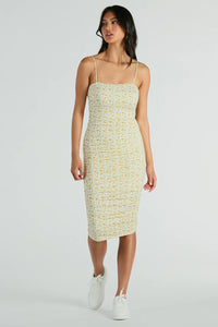 Enter the fresh fragrance of this floral midi dress into your spring and summer lineup! With a square neckline and spaghetti straps, this dress will hug your curves in all the right places with its bodycon fit. The side ruched seams add more detail to this stylish midi-length dress. Complete the look in platform sneakers for a trendy allure.