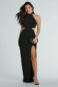 Luxe detailing meet a sultry silhouette in the Avalynn halter cutout crepe formal dress. Designed with a structured crepe fabric with a moderate stretch, this long dress will give you a polished and chic look perfect for a black-tie affair. Her sleeveless bodice features a high halter neckline and a partial open back, leading to alluring asymmetric cutouts at the waist. Her floor-length hem is accented with a high-cut front slit to showcase some leg and a slim-fit silhouette to accentuate your gorgeous curves. Complete your look with rhinestone statement earrings and stiletto heels.