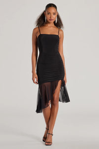 You better grab your girls and go out tonight in this sleeveless midi dress! This stunning dress features a square neckline, spaghetti straps, and a bodycon silhouette to accentuate your figure. The sheer mesh ruffled slit midi-length hem adds a touch of sass! Complete the look in stiletto heels and a clutch.