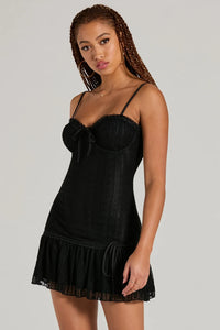 A lace A-line mini dress that will captivate everyone in the room! With a playful sweetheart neckline, adjustable spaghetti straps, and an underwire bust, this dress accentuates your curves, while the A-line silhouette and ruffled tie mini-length hem add a touch of whimsy. Complete the look with a clutch for a dressy evening event.