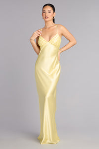 Polished with a soft, luminous allure, the Ruby dress is designed for evenings that call for effortless sophistication. Crafted in satin fabric, this column floor-length silhouette features a sequin beaded mesh V-neckline bust, delicate adjustable spaghetti straps, and a low back cowl detail that feels refined yet memorable.