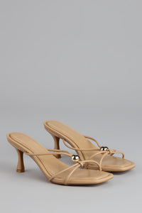 These strappy square toe stilettos feature a sleek mule silhouette topped with a chic gold ball accent that turns every step into a statement.