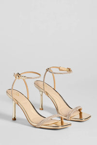 - Thin toe strap and ankle strap, rhinestone embellishments