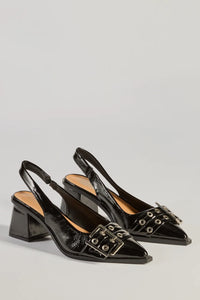 Pull off an edgy-glam allure in these patent leather slingback buckle pumps perfect for styling with a crossbody purse.