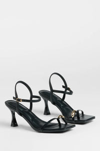 Show off a fabulous strut in these sleek strappy kitten heels with a trendy gold metal ring accent.