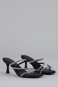 These gorgeous stiletto mules showcase a sophisticated rhinestone-embellished strappy design accented with delicate butterfly details that'll make your formal or dressy look soar!