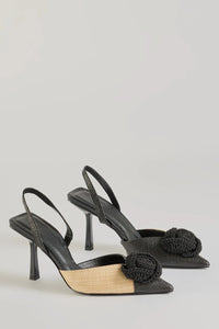 Show up looking trendy and fab in these raffia design pumps featuring a closed pointed toe with a braided flower applique, a sling-back strap, and a sleek stiletto heel. Style with a midi dress for a rooftop bar!