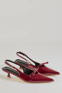 Adorable and chic, these sleek patent faux leather pumps feature a closed pointed toe, a bow accent strap, an adjustable sling-back strap, and a short kitten heel. Style with an oversized blazer.