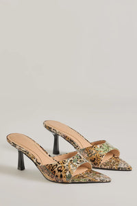 Roar with style in these luxe leopard and palm leaf print stiletto mules perfect for styling with a chic matching set for a weekend escape!