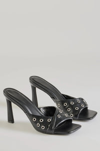 Amp up your look with these trendy faux leather stiletto mules featuring an open square-shaped toe, a twist strap design with sleek grommet accents, and an open back for effortless on-and-off styling. Pair with a chic shoulder bag.