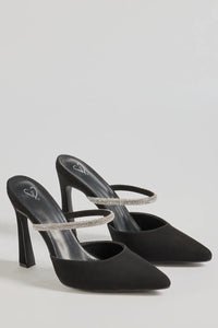 Turn heads in sparkly chic rhinestone strap stiletto heels. Faux nubuck, rhinestone toe strap, and adjustable ankle straps make these a luxe fit. Perfect for your next glam night out!