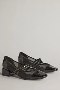 A chic twist on a classic, these Mary Jane faux leather block heels with mixed patent leather and mesh material with dual buckle strap accents. Style these shoes with a purse.