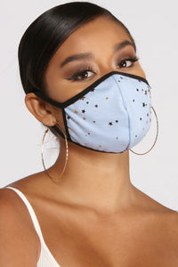 Bring the glam in a metallic face mask. Fitted with a breathable knit fabric adorned with small metallic stars, contrasting black trim, and earloops for a customized comfortable fit.