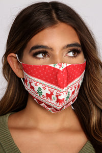 Spread holiday cheer in a festive face mask this season! The face mask features a red reindeer and snowflake print, and earloops for a customized fit. Complete your festive look with a beanie, sweater, and high waist jeans.