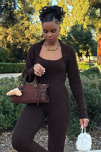 For the girls who lounge like it’s an art form. This chenille bolero serves soft luxury with its fuzzy texture and chill-but-chic vibe. Style with the matching catsuit to officially master cozy glam.