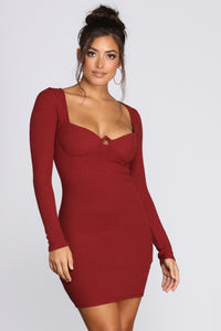 You're a stylish girl who likes her look to be a little sultry too! This ribbed knit mini dress features long fitted sleeves, a wired sweetheart neckline with padded cups and a small front cut out, and a short, form hugging fit. The dress offers plenty of stretch.