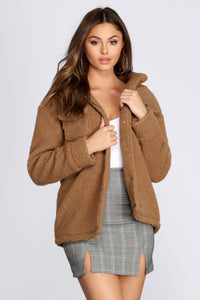 Amp up your casual look with a cute teddy jacket! Designed with a collared neckline, long sleeves, and functioning sleek metal buttons down the center. Jacket features traditional breast pockets that have functioning buttons as well. Trucker jacket is composed of faux fur, and fully lined on the inside!