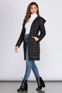 Oh yes girl, this jacket has luxury written all over it! Designed with a long hem, long sleeves, pockets, and a hood this light weight jacket is a definite winter staple! Composed of a nylon material with puff, and offers slight stretch and a relaxed fit. What we love about this jacket is that it is light weight enough to layer with our favorite fall attire!