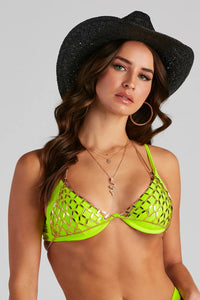 Edge up your festival fit in this chain-link bralette featuring a plunge v-neck, triangle-shaped cups, with an adjustable lobster clasp closure on the back for a secure fit. Complete the look in an eye-catching bikini set and boots.